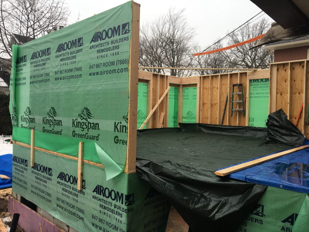 (The basement framing hasn’t started yet because weather has prevented the concrete contractor from pouring the slab, so eventually the carpenters will need to return to finish that work and remove their temporary LVL beam. When they return, they will also pour the piers needed for structural support on the inside of the house.)