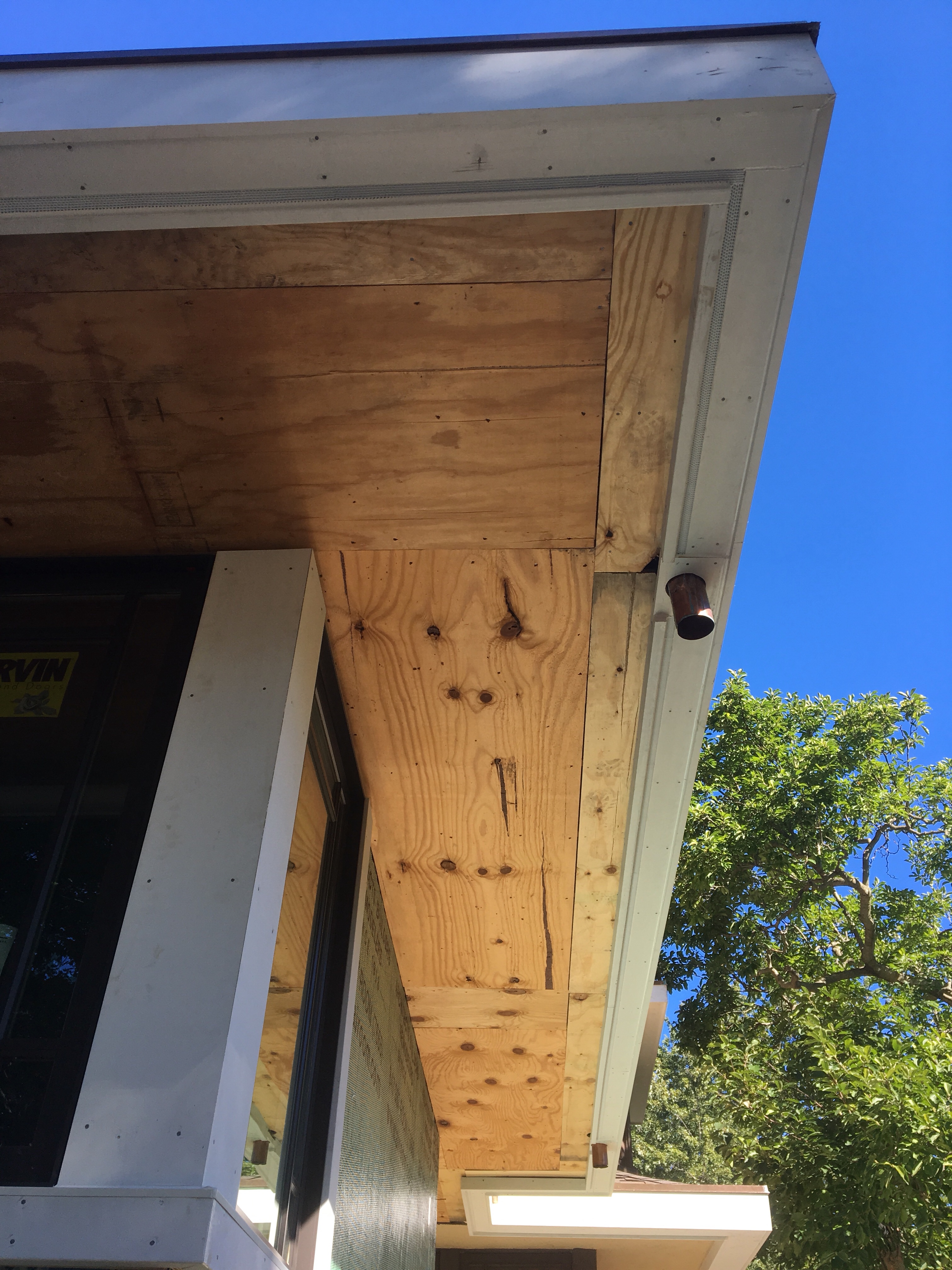 If you look closely, you can also see the vent, which is a clever continuous soffit vent that is concealed in the trim and runs around the entire addition. You can also see the strip of plywood cut to patch the hole that was left. The plywood will be finished with stucco.